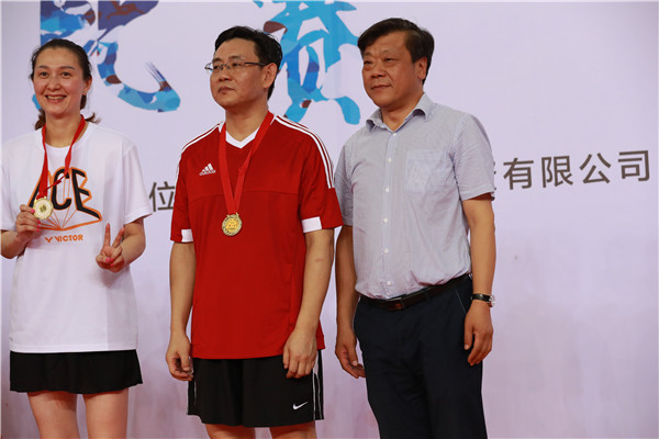 武汉市体育局局长王沈顺为武汉经济技术开发区工委书记、汉南区委书记胡亚波颁发混双冠军奖牌