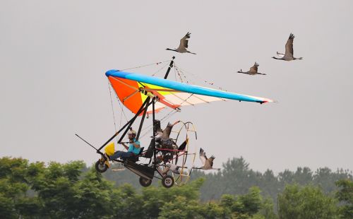 本次大会还首次引入“大雁伴飞”表演项目、模拟空战、飞机在皮卡上悬停等精彩表演项目。特别是“大雁伴飞”表演,9只灰雁、8只蓑羽鹤与动力悬挂滑翔机一起御风飞翔,让现场观众大饱眼福。