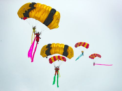 运动员跳伞表演“仙女下凡”,每个跳伞运动员都带着一条20米长的彩带定点降落到会场指定位置。