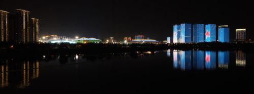 (武汉体育中心位于武汉开发区美丽的南太子湖畔。)