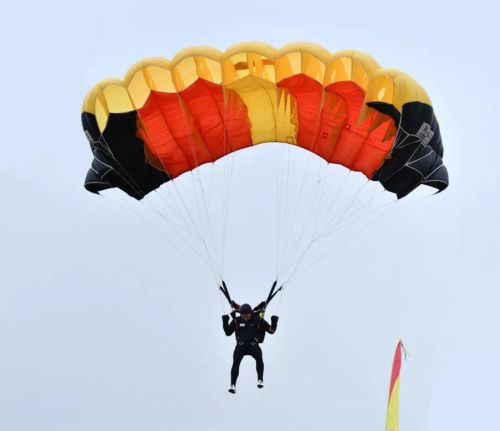 德国选手WIESNER STEFAN在军运会跳伞比赛中。新华社 发